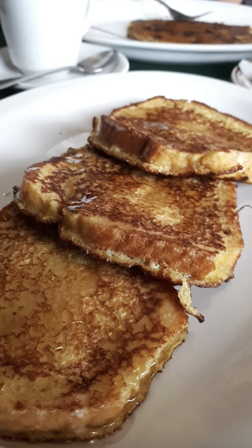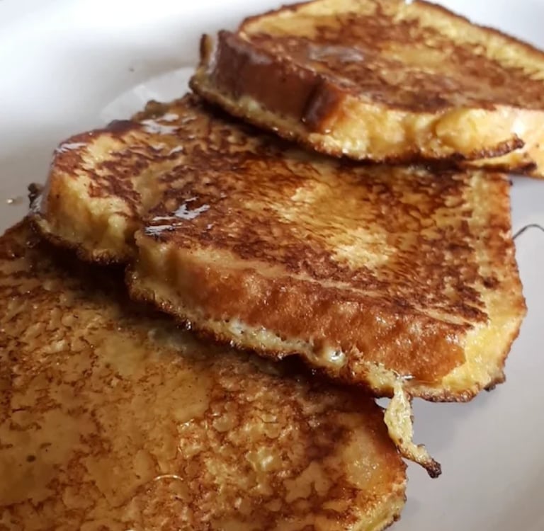 3 Slice Of French Toast Served With Pancake Syrup & Sprinkled With Cinnamon